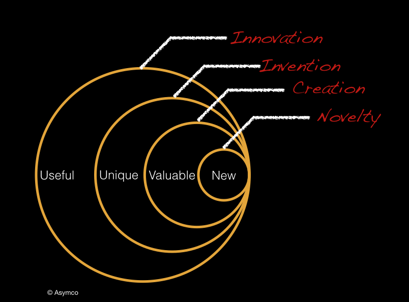 Creations are novel, inventions are creations and innovations are usually based on some invention. However inventions are not innovations and neither are creations or novelties. Innovations are therefore the most demanding works because they require all the conditions in the hierarchy. Innovations implicitly require defensibility through a unique “operating model”.