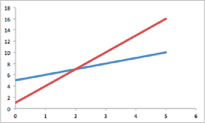 To conceptualize this, picture two mathematical functions on the same graph: A and B. Function A (blue line) has a high y-intercept, but a slope of one. Function B (red line) has a low intercept, but a slope of three. At first, the value of Function B will appear below that of A. However, it will not take long for the value of B to surpass that of A because it has a steeper slope.